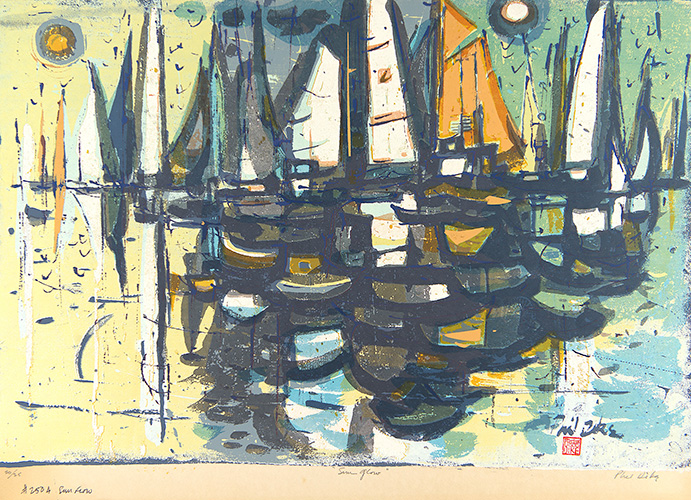 Throughout his career, Dyke was repeatedly drawn to coastal and maritime subjects. Harbors, docks, sailboats and open water provided an ideal framework for his artistic interests, allowing him to balance strong structure with expansive space. In scenes that range from lively harbor activity to quieter, more contemplative seascapes, Dyke often reduced the coastal world to essential forms, rhythms and color relationships. Birds, masts and reflections animate these compositions, creating a sense of movement within carefully controlled designs.